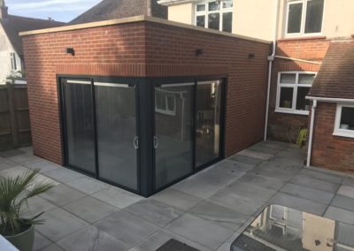 The client wanted a lounge flowing through to the garden. So we extended the living space off the existing kitchen into a patio garden.
